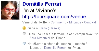 Dopo avere parlato qui delle cose che non mi convincono troppo di Foursquare, se dovessi invece spiegare in poche e semplici parole perché secondo me questo location based social network sta ottenendo un successo planetario, molto probabilmente mi limiterei a mostrare un paio di Twitt di Domitilla che secondo me sono esplicativi più di qualsiasi spiegazione verbale.