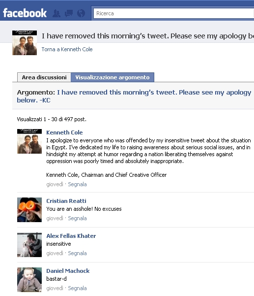 Allora Kenneth Cole pensa di pubblicare una frase di scuse anche sulla pagina Facebook del suo brand.