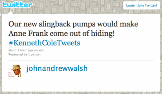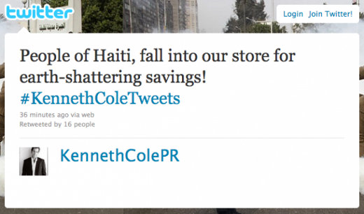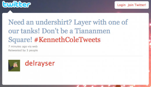 Il signor Kenneth Cole, ritenendosi particolarmente furbo e spiritoso, pubblica un tweet molto particolare dal suo BlackBerry, usando l’account legato al suo brand.