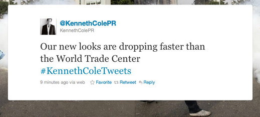 Secondo Trendistic giovedì scorso c’è stato un periodo durante il quale lo 0,23% di tutti i tweets erano legati a Kenneth Cole.