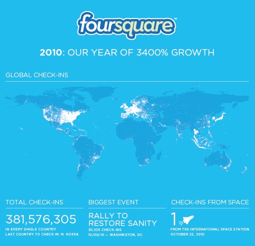 A parte questi metodi empirici, l’unica fonte ufficiale che parli dell’utilizzo di Foursquare in Italia mi risulta essere questa mappa dei check-in nel mondo, dalla quale si vede che siamo uno dei Paesi più attivi: in ogni caso è un po’ pochino.