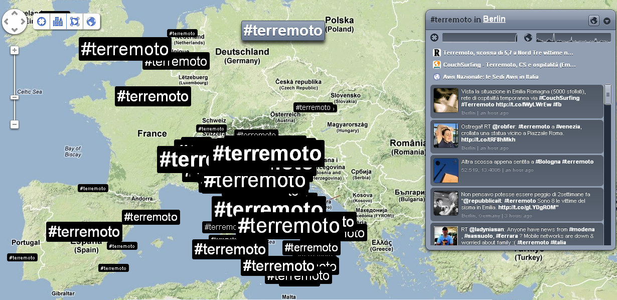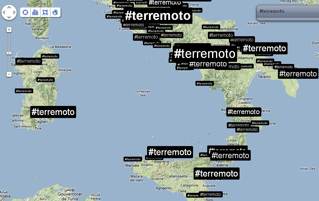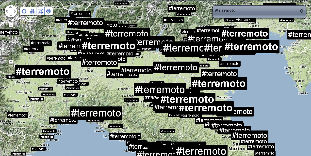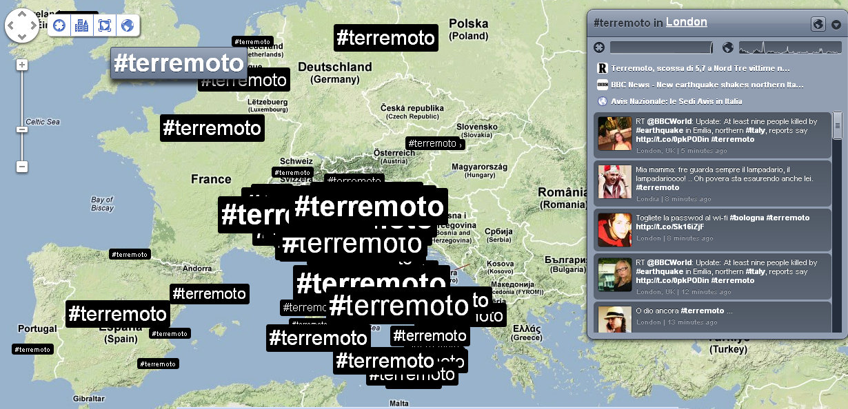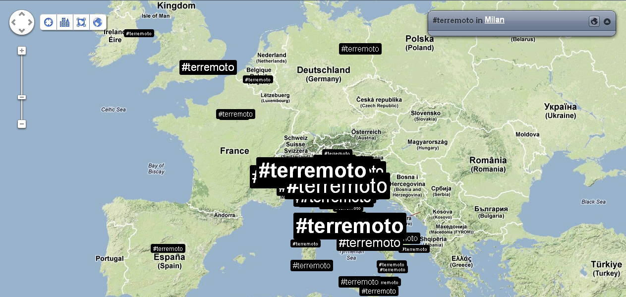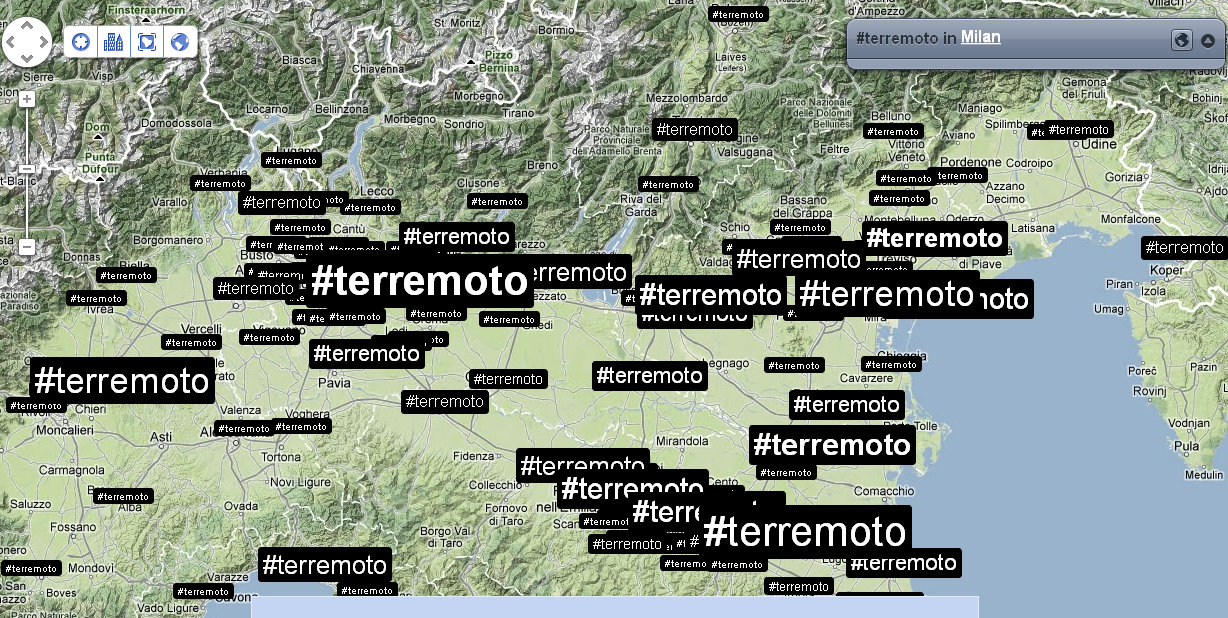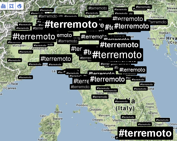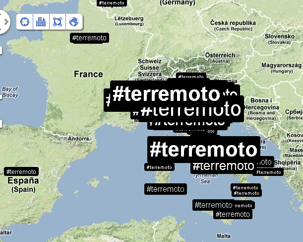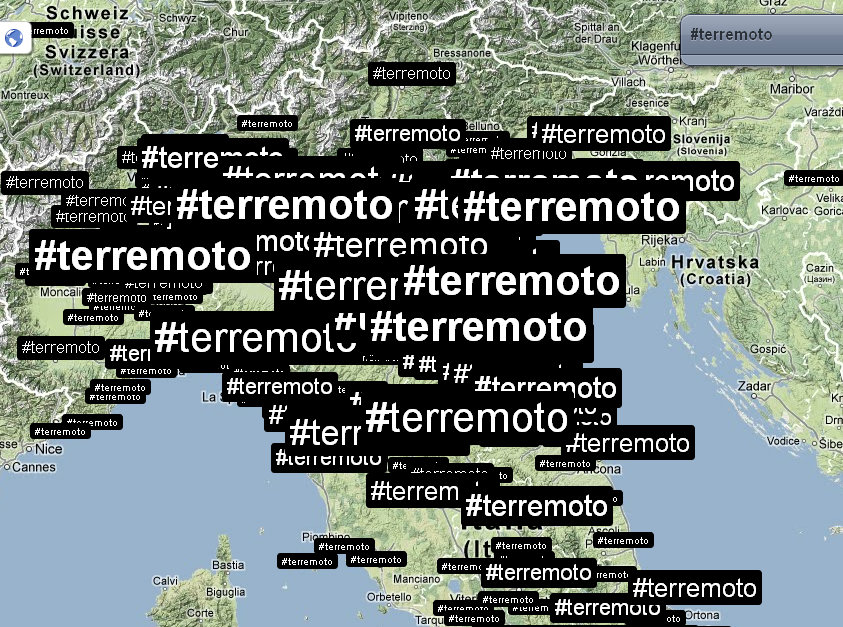 Alle 14:05 ci fanno rientrare nel palazzo: verifico nuovamente la distribuzione dei tweet e dei trend sul territorio. Mi accorgo che ormai che parlano in tutto il mondo, così rilevo anche le reazioni nelle città principali. Con un occhio sulla timeline di Twitter, vedo anche che in Italia c’è addirittura chi tenta di fare del Noto anche degli inusuali tweet in Sud Tirolo, perché questa volta il terremoto viene percepito fin lì.