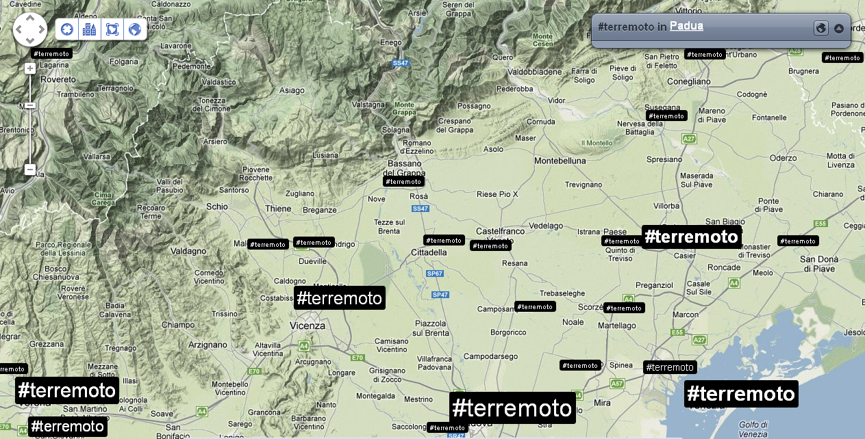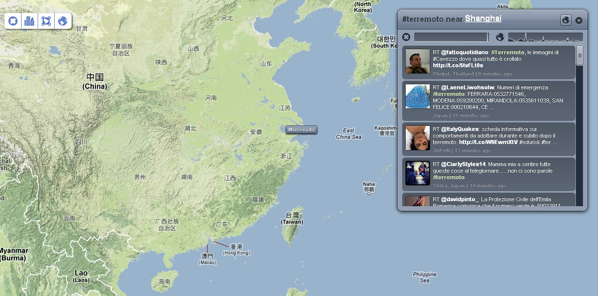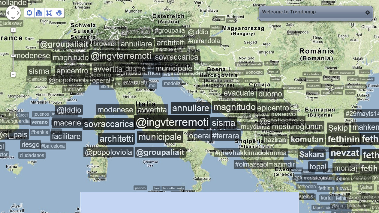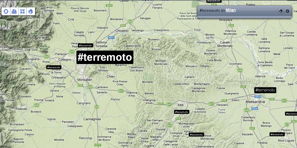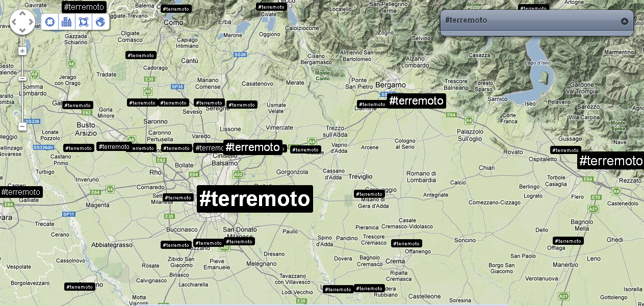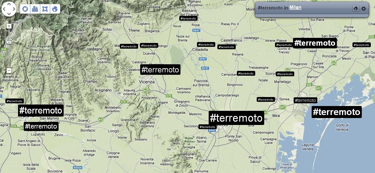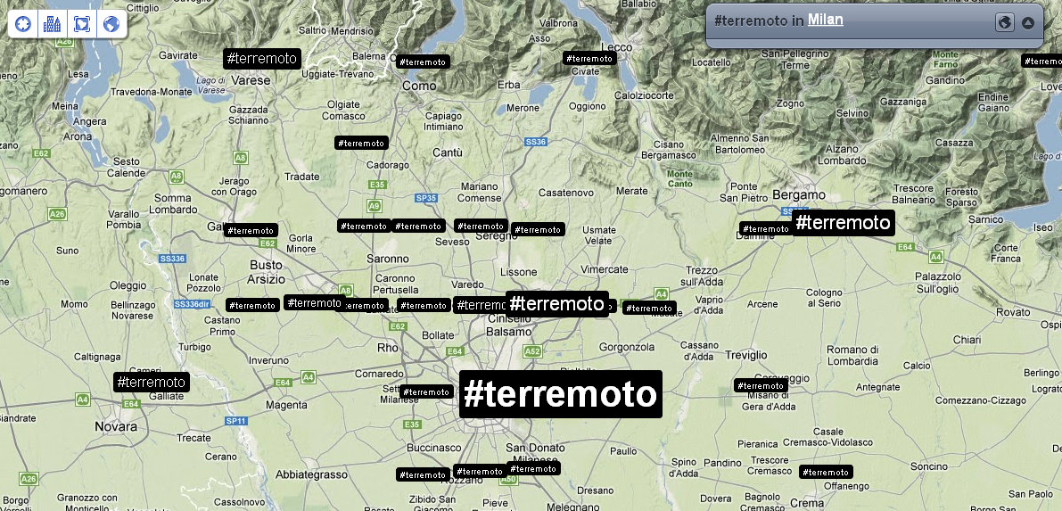Alle 14:05 ci fanno rientrare nel palazzo: verifico nuovamente la distribuzione dei tweet e dei trend sul territorio. Mi accorgo che ormai che parlano in tutto il mondo, così rilevo anche le reazioni nelle città principali. Con un occhio sulla timeline di Twitter, vedo anche che in Italia c’è addirittura chi tenta di fare del Noto anche degli inusuali tweet in Sud Tirolo, perché questa volta il terremoto viene percepito fin lì.