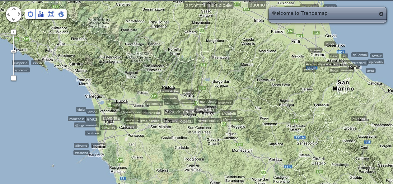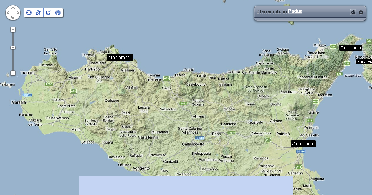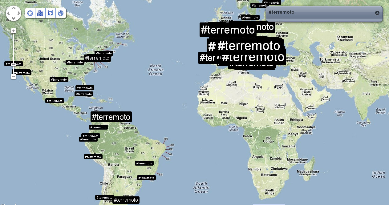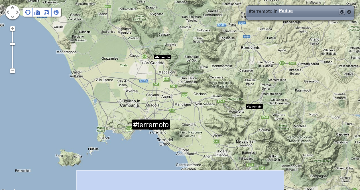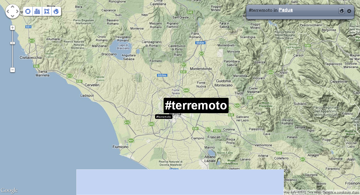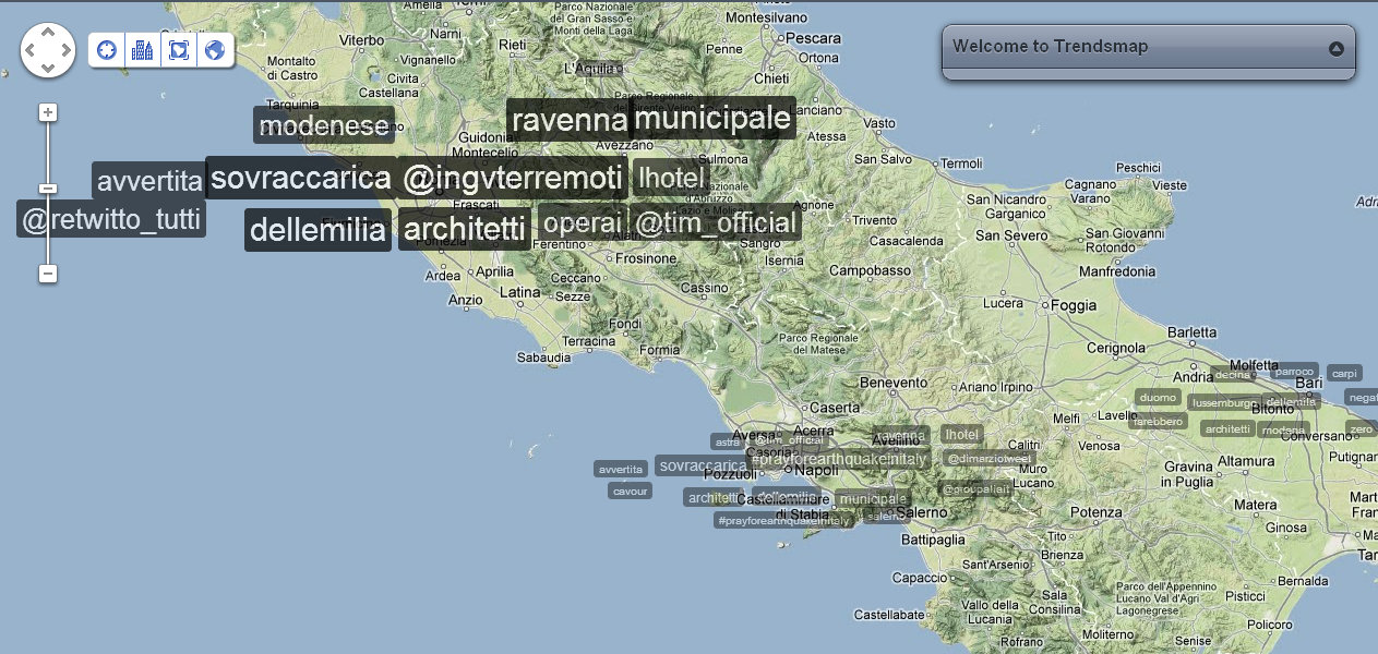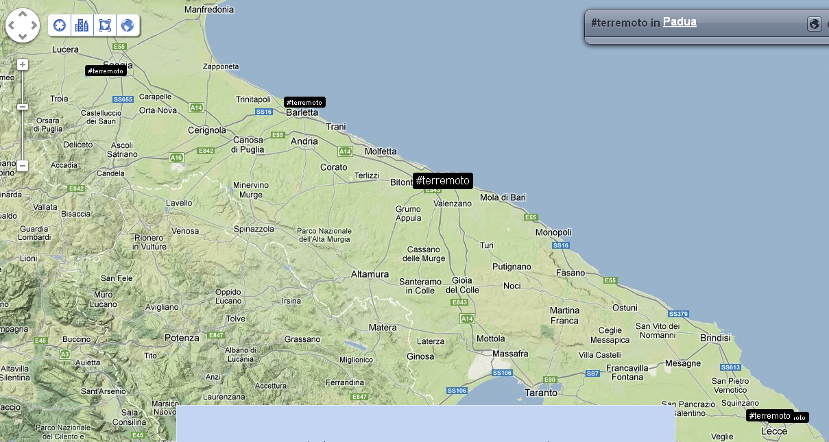 Alle 14:05 ci fanno rientrare nel palazzo: verifico nuovamente la distribuzione dei tweet e dei trend sul territorio. Mi accorgo che ormai che parlano in tutto il mondo, così rilevo anche le reazioni nelle città principali. Con un occhio sulla timeline di Twitter, vedo anche che in Italia c’è addirittura chi tenta di fare del Noto anche degli inusuali tweet in Sud Tirolo, perché questa volta il terremoto viene percepito fin lì.