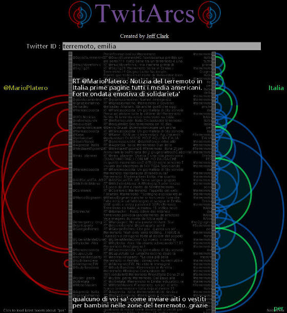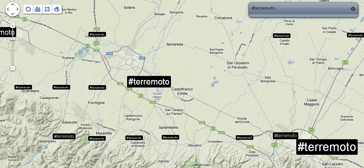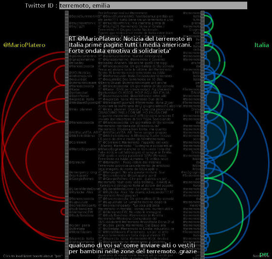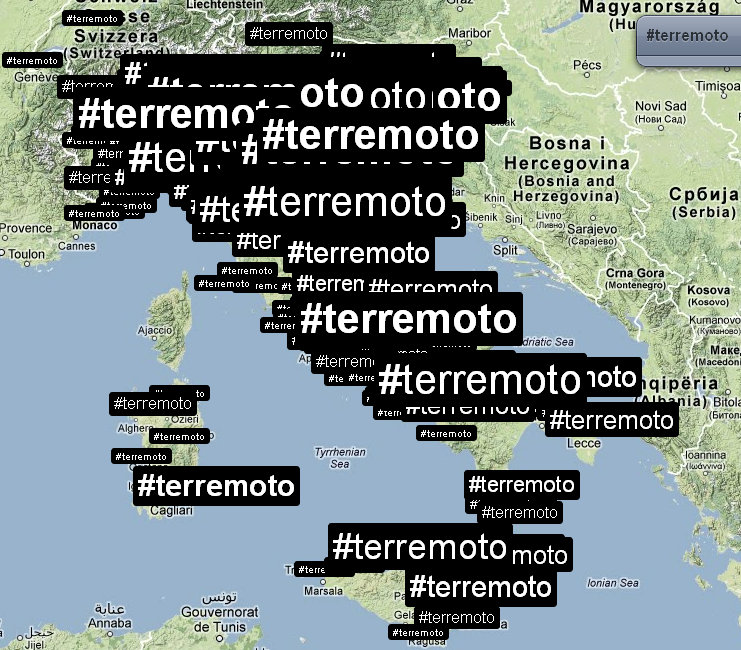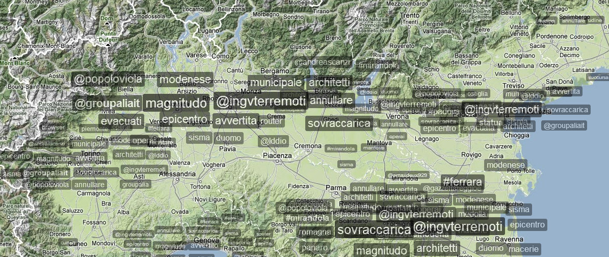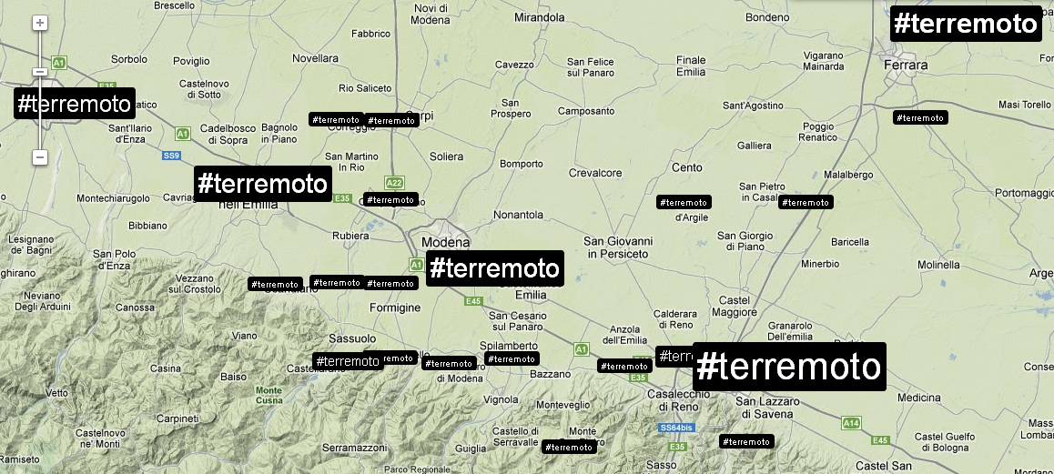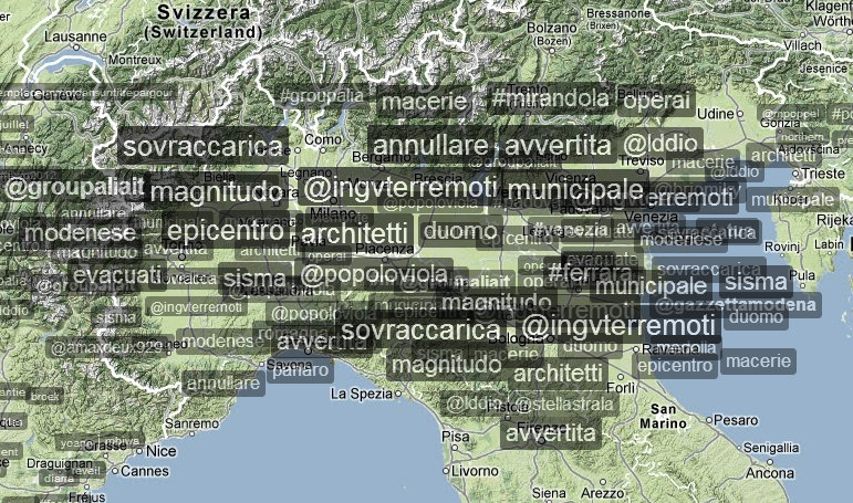 Verso le 18 il numero di tweet per singolo account era notevole, ma destinato a incrementarsi ulteriormente la mattina successiva, quando i contenuti diventano più specifici e geolocalizzati. Il generico hashtag #terremoto viene infatti rapidamente affiancato da numeri di telefono, indirizzi, località e aree geografiche, piuttosto che proposte concrete come l’annullamento della parata militare per la ricorrenza del 2 giugno, identificata dall’hashtag #no2giugno, oppure l’annullamento della partita della nazionale di calcio italiana che avrebbe dovuto svolgersi proprio a Parma.