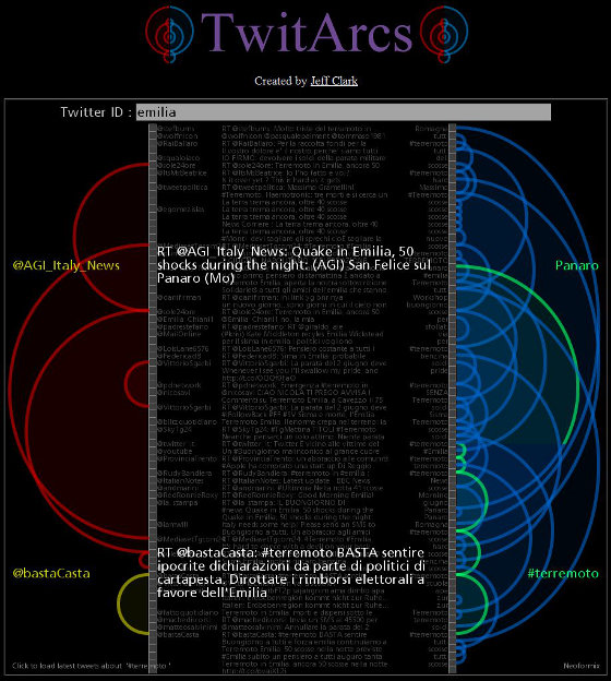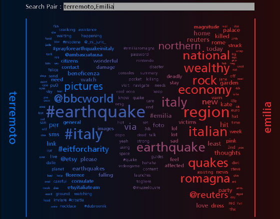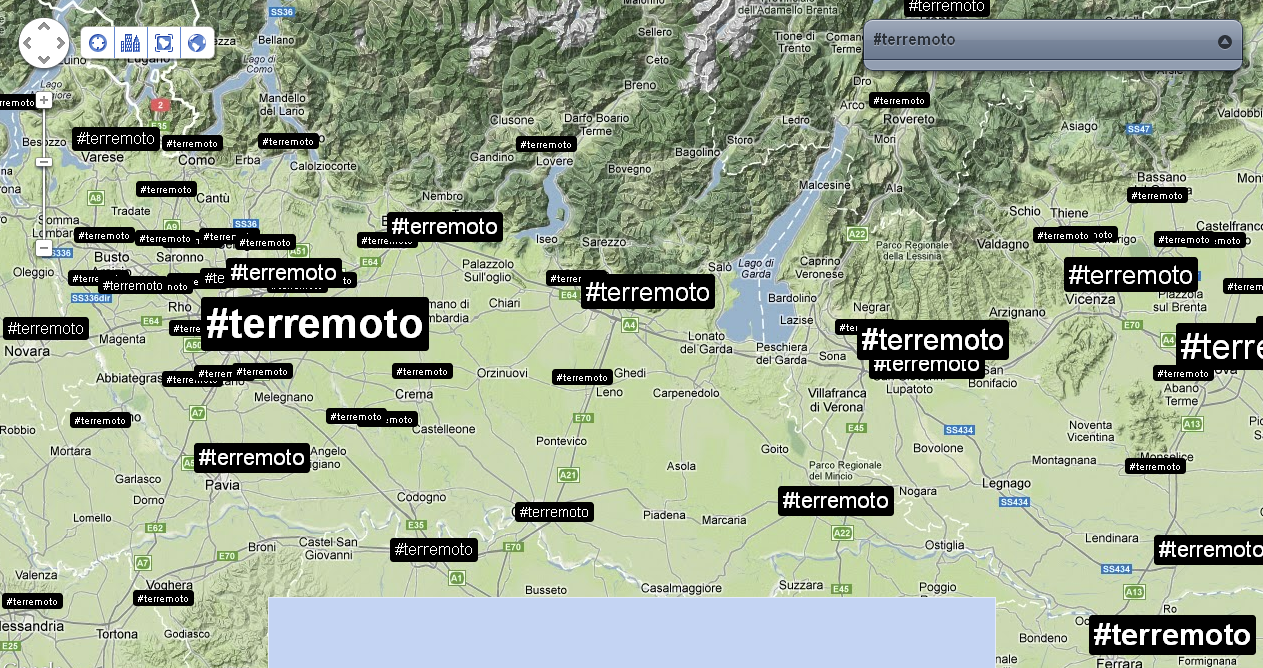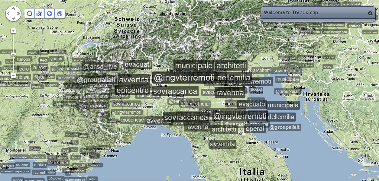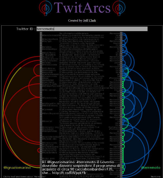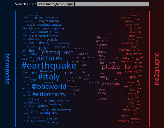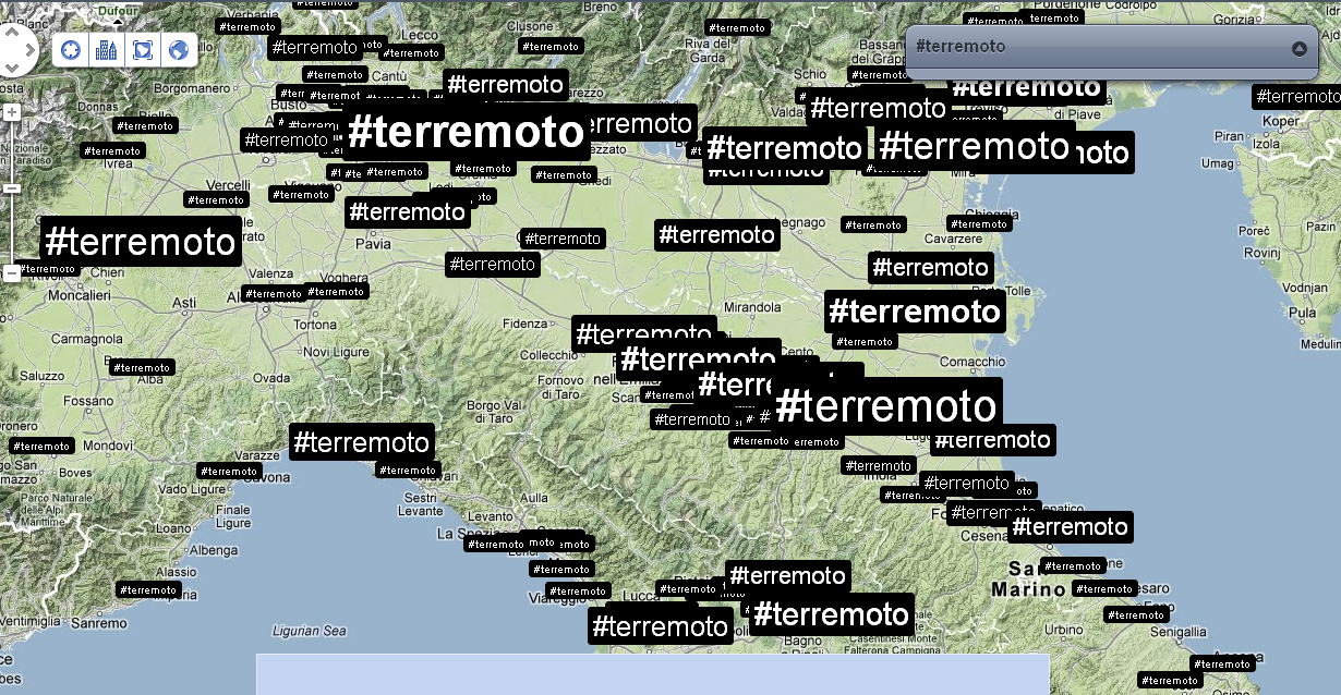 Verso le 18 il numero di tweet per singolo account era notevole, ma destinato a incrementarsi ulteriormente la mattina successiva, quando i contenuti diventano più specifici e geolocalizzati. Il generico hashtag #terremoto viene infatti rapidamente affiancato da numeri di telefono, indirizzi, località e aree geografiche, piuttosto che proposte concrete come l’annullamento della parata militare per la ricorrenza del 2 giugno, identificata dall’hashtag #no2giugno, oppure l’annullamento della partita della nazionale di calcio italiana che avrebbe dovuto svolgersi proprio a Parma.