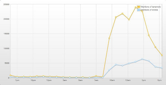 I tweet sono tanti, tantissimi: il picco massimo per l’hashtag #terremoto si verifica intorno alle 13:30, quando sfiora quota le 25 mila mentions, mentre emilia arriva a circa 6 mila intorno alle 15.