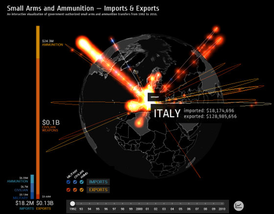 La visualizzazione interattiva permette di esplorare i flussi di import-export di armi leggere tra le nazioni e il loro andamento nel corso del tempo.
