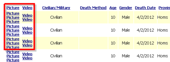 Una accurata attività di monitoraggio costante dei morti e degli arrestati viene svolta da VDC (Center for Documentation of Violations in Syria), un’organizzazione il cui sito è stato rifatto dopo che essere anche stato violato – così pare – dai tecnici informatici dell’esercito governativo.