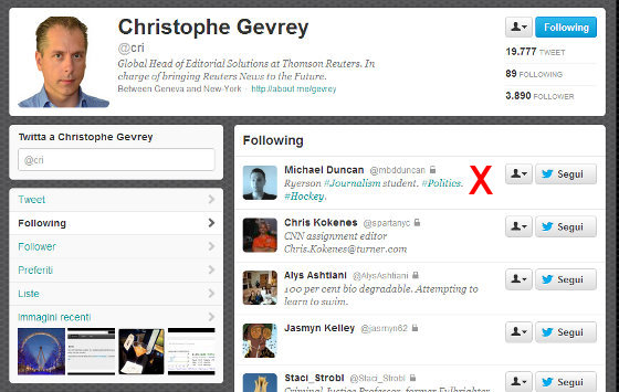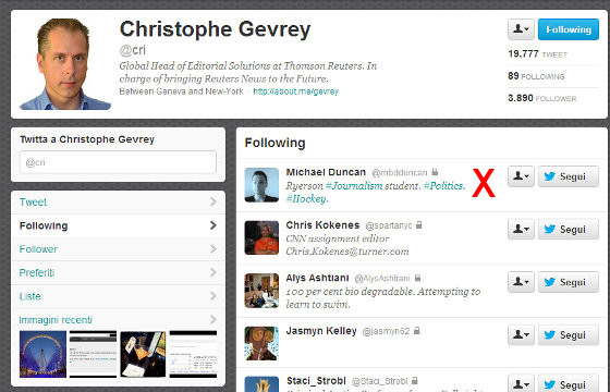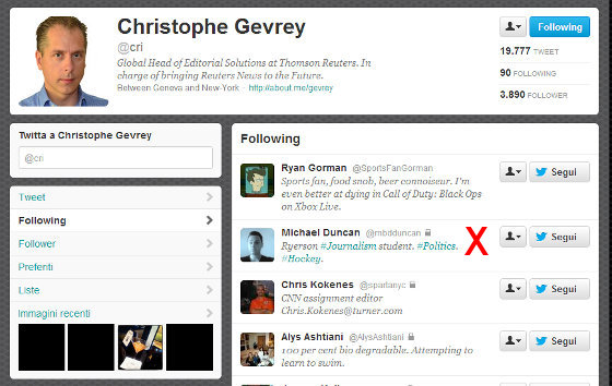 In pratica, ogni due minuti inizia a seguire un nuovo account e poi revoca subito l’iscrizione. Nel frattempo, nella casella email del sottoscritto arriva la notifica che tale Christophe Gevrey di Reuters lo sta seguendo su Twitter. Ed è persino uno dei 90 che lui ritiene interessanti. In molti ricambiano, lusingati.
