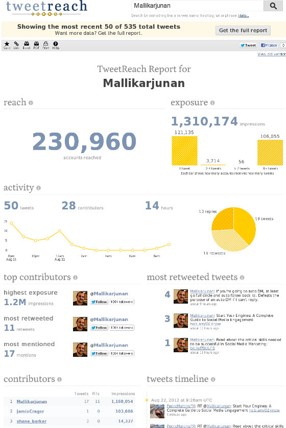Secondo Tweetreach, lo stesso giorno Mallikarjunan avrebbe ottenuto oltre 100 mila impression teoriche grazie alla menzione di un singolo tweet di JamieCrager i cui follower secondo Status people sarebbero 36% Good, 32% inactive e 32% fake (da prendere con le pinze perché mi sembra che in generale Status People offra indicazioni molto spannometriche).