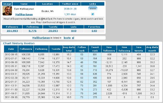 Osservate attentamente cosa avviene il 7 aprile e il 20 maggio all’account Twitter di Sam: dall’analisi dei suoi follower eseguita attraverso Wildfire risultano due decise impennate del numero dei follower, normali solo per chi vince il Premio Pulitzer o una medaglia d’oro alle Olimpiadi. Oppure per chi acquista follower falsi al mercato nero.