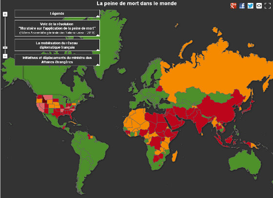 Un’altro studio, effettuato questa volta da France Diplomatie, mostra invece attraverso una mappa interattiva la distribuzione della pena di morte nel mondo. Purtroppo, questi dati non sono esportabili.
