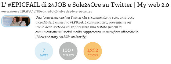 Sul tardo pomeriggio di lunedi 29 pubblico sul mio blog lo Storify con l’incredibile racconto di ciò che stava accadendo su Twitter intorno all’account @24JOB gestito da una giornalista per conto del Sole24Ore. Probabilmente sono il primo a farlo, visto che l’attenzione generale si concentra sul mio pezzo.