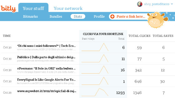Grazie a Tweetcharts vediamo che la frequenza dei tweet è stata abbastanza sostenuta e prolungata, che gli accessi sono avvenuti principalmente da browser, che escludendo l’hashtag epicfail (contenuto nel titolo del mio post) il più usato diventa #poernano e che i link più condivisi sono stati quelli ai miei contenuti.