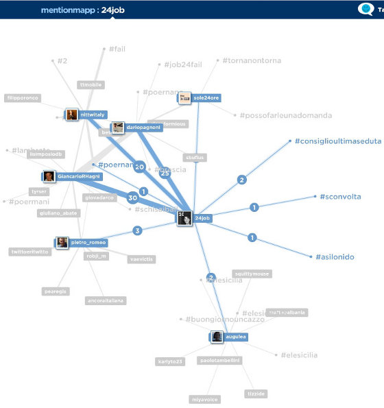Quali account hanno citato 24JOB e quante volte? Quali sono gli hashtag utilizzati? Ce lo rivela Mentionmapp, un tool visuale molto immediato.