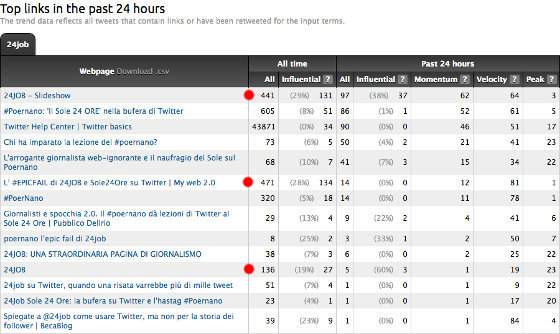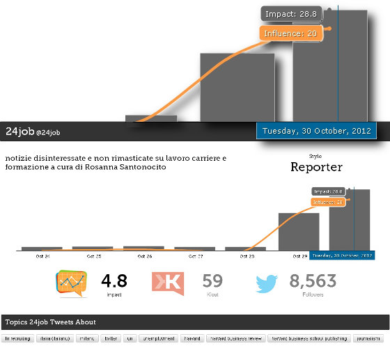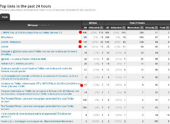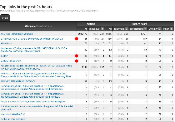 Twitalyzer si accorge che l’account Twitter di @24job è diventato improvvisamente popolare e lo interpreta come segno di influenza, il che effettivamente non è sbagliato, visto che l’influenza non tiene conto del sentiment.