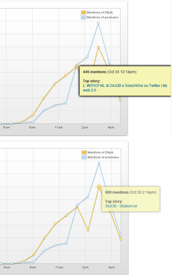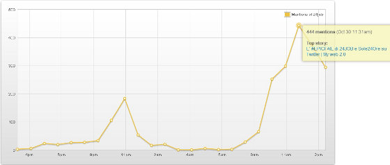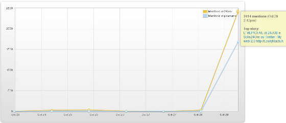 Confrontando il grafico di lunedì con quello del giorno dopo balza subito all’occhio l’enorme visibilità acquisita dalla vicenda con la seconda spinta.