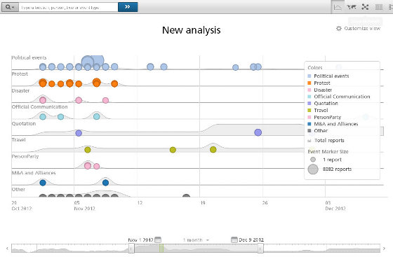 I campi di applicazione sono diversi, come la ricostruzione di avvenimenti, la ricerca di informazioni sui prodotti commerciali oppure l’identificazione dei legami tra organizzazioni, luoghi, prodotti e persone. Include persino l’analisi del sentiment. E’ per esempio possibile soddisfare curiosità come “Quale capo di Stato ha visitato la Libia nel 2010?”, “Quali compagnie farmaceutiche hanno commercializzato nuovi prodotti nel primo trimestre del 2012?”, “Quali blogger francesi stanno parlando in questo momento dell’uragano Sandy?”, “Cosa è successo a Baghdad negli ultimi 60 giorni?“.