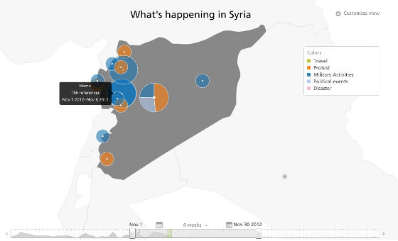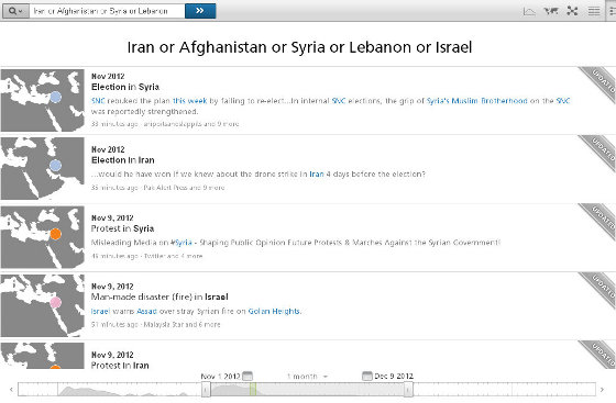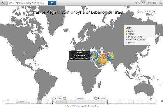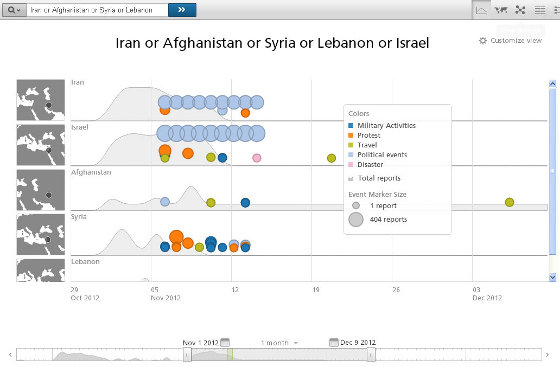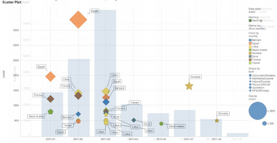 Ma non è tutto qui: questo servizio mette anche a disposizione degli sviluppatori le API per esportare e rielaborare a proprio piacimento i dati. Utilizzando servizi esterni si possono ottenere elaborazioni come questa, che descrive la Primavera araba.