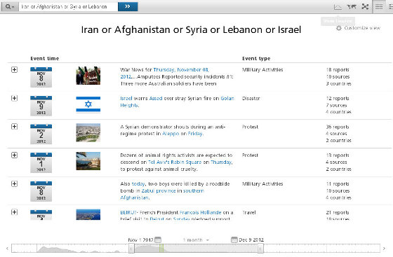 Gli eventi che rileva sono per esempio disastri naturali o eventi socio-politici di protesta, anche quelli pubblicati in lingua cinese o araba, provenienti da oltre 150 mila fonti selezionate.